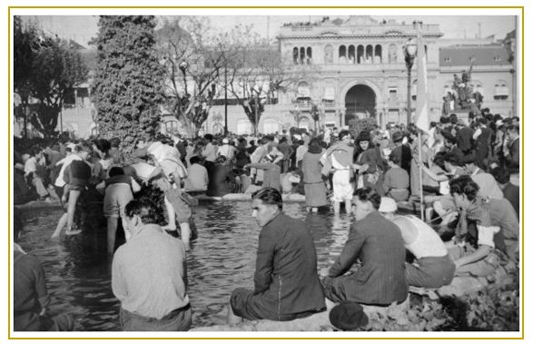 17 de octubre de 1945. Plaza de Mayo. Las multitudes que llegaron a la plaza caminando desde la provincia de Buenos Aires, meten los pies en el agua de la fuente. Archivo General de la Nación
