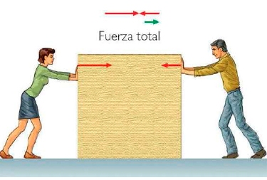 En el siguiente ejemplo, la situación cambió. Las fuerzas individuales se aplican en sentidos opuestos y son de intensidades diferentes (observar flechas rojas). Ahora la fuerza total (neta o resultante) será la suma de ambas intensidades y sentidos (ahora opuestos). Cómo la fuerza individual con dirección derecha (la de la mujer) es mayor que la de dirección izquierda (la del hombre), la resultante queda hacia la derecha y de una intensidad igual a la diferencia entre la fuerza mayor y la menor (verde):