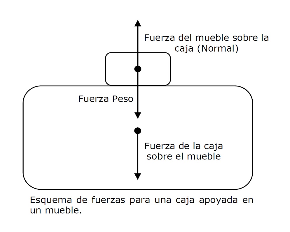 En la figura anterior se pueden ver tres fuerzas: dos de ellas sobre la caja: la fuerza Peso y la fuerza del mueble sobre la caja (Normal), y la tercera sobre el mueble: la fuerza que la caja ejerce sobre este.