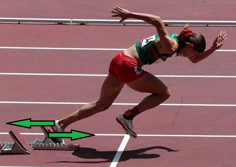 La fuerza que su pie ejerce sobre el apoyo de la largada (llamado taco de largada) es de igual dirección e intensidad pero sentido contrario, que la fuerza que dicho taco ejerce sobre su pie. Dado que el taco de largada se encuentra fijado al suelo, este no se mueve por efecto de la fuerza que la corredora le imprime, pero la fuerza que realiza el taco impulsa a la corredora hacia adelante.