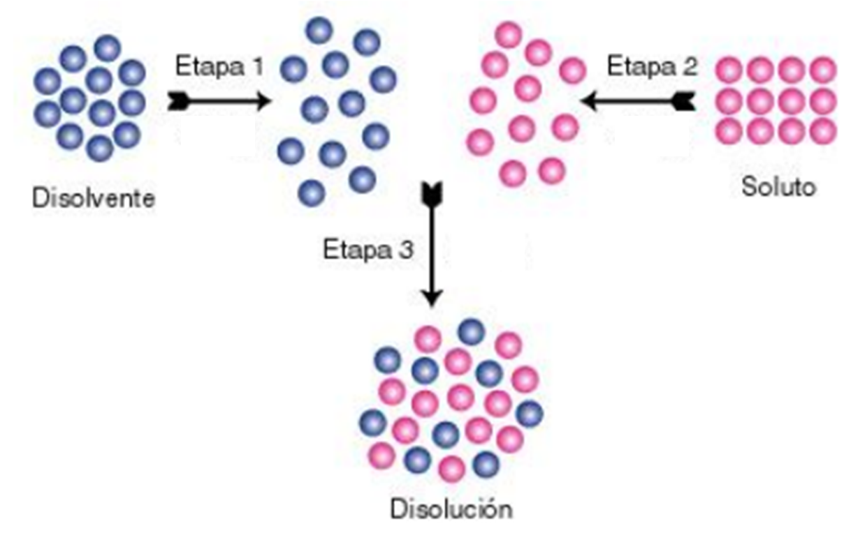 A grandes rasgos, podemos imaginar la disolución como un proceso en tres etapas: i- en la primera etapa se separan las moléculas de soluto (azúcar); ii- en la segunda se separan las moléculas de solvente (en esta etapa se necesita gastar energía para vencer las fuerzas de atracción entre las partículas se solvente); iii- se mezclan las moléculas de solvente y las de soluto. En algunos casos estos procesos ocurren en forma espontánea, en otros no. Además, estos procesos pueden ser endotérmicos (quiere decir que se necesita energía en forma de calor para que ocurran, por ejemplo, se necesita calentar la mezcla) o exotérmicos (se libera energía en forma de calor cuando ocurre la mezcla).