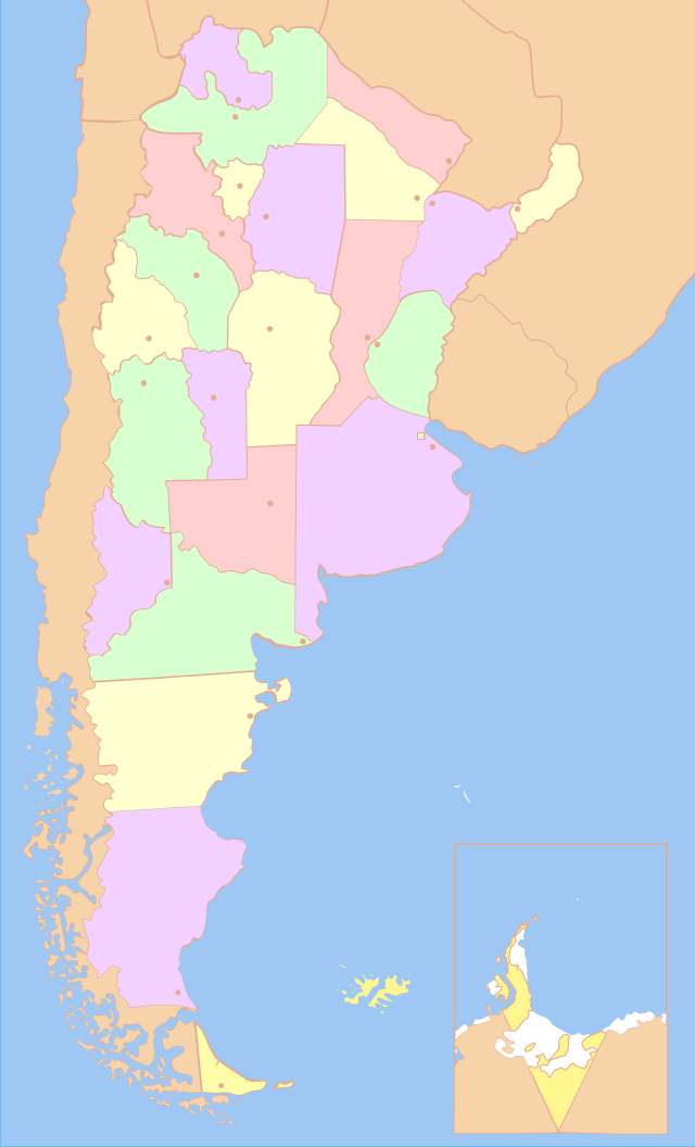 Como ejemplo del teorema de cuatro colores, veamos el mapa de la República Argentina (realizado por el Instituto Geográfico Militar), con sus provincias coloreadas aquí con cinco colores.