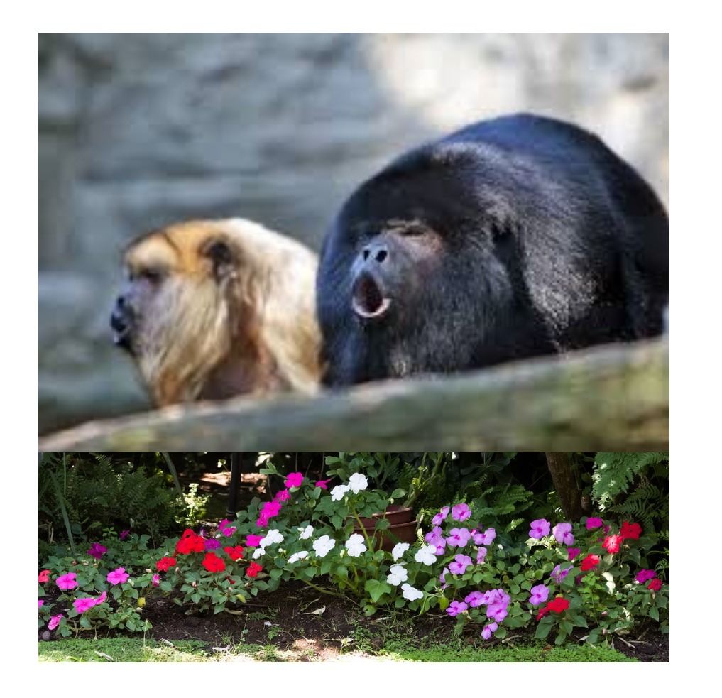 Figura 5: Monos aulladores de diferente coloración de pelaje y flores de alegría del hogar. La variabilidad, o diferencias entre individuos de una misma especie, es característica de todos los organismos vivos y extintos.