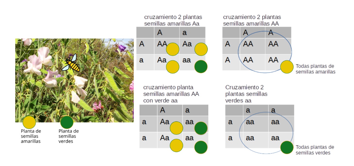 Figura 7: Posibles cruzamientos de plantas de arvejillas. Al igual que en los estudios de Mendel, los insectos polinizadores como las abejas juntan el polen con los óvulos provenientes de distintas plantas, como las que vemos en la foto. Cada una porta una combinación de alelos: las plantas de semillas amarillas pueden ser AA o Aa; plantas de semillas verdes que son aa. Las tablas o cuadros (denominados cuadros de Punnet) muestran los resultados de la unión de las distintas gametas, que vendrían a formar las semillas o nuevos individuos. Las gametas (A y a) se unen y dan origen a los nuevos individuos (AA, Aa y aa), con semillas amarillas o verdes.