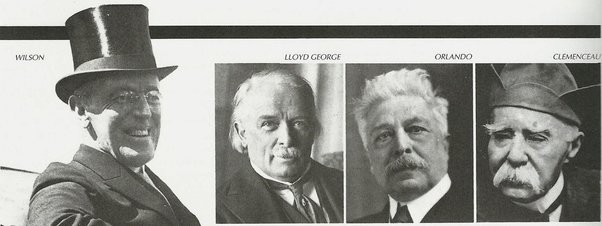 De izquierda a derecha: Thomas Woodrow Wilson (presidente de Estados Unidos), Lloyd George (Primer Ministro del Reino Unido), Vittorio Emanuele Orlando (Primer Ministro italiano) y Clemenceau (Primer Ministro de Francia).
