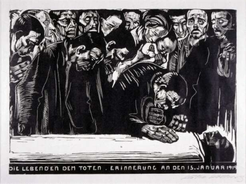 En la siguiente imagen pueden observar el grabado que la artista alemana Khäte Kollwiz le dedicó a Karl Liebknecht en donde se expresa el dolor de los/as compañeras y de los trabajadores.