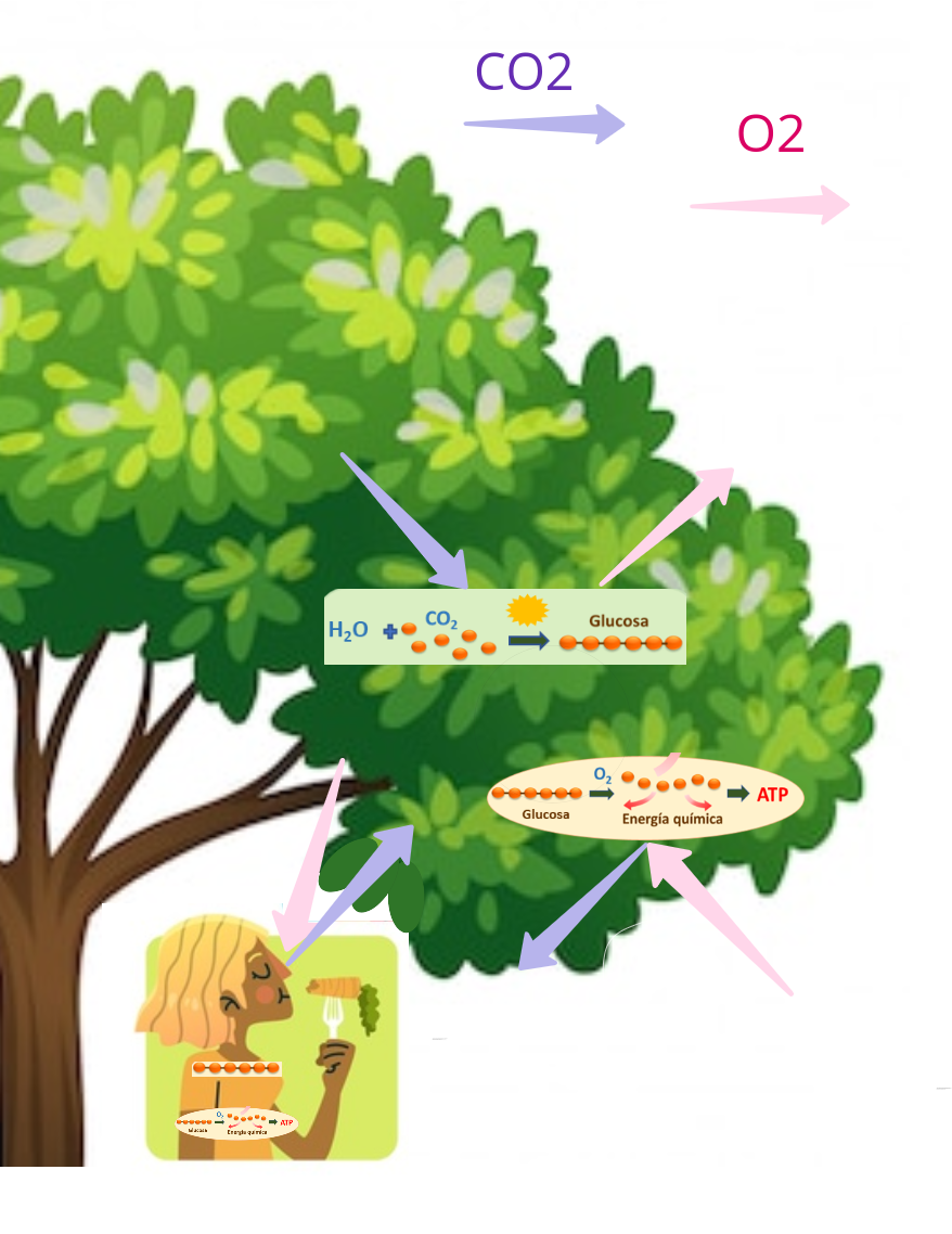 Figura 12: la fotosíntesis y la respiración funcionando en un árbol y una persona. Las flechas de color rosa indican movimiento de O2, y las flechas de color lila indican movimiento de CO2. Noten cómo el O2 producido en la fotosíntesis del árbol podría ser inspirado por la persona y utilizado en su respiración celular.