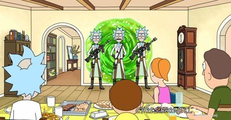 Así se introduce el multiverso de Rick y Morty. En la serie no existe sólo una, sino múltiples, incluso infinitas dimensiones de la realidad. Cada una de ellas es distinta, porque difiere de las otras al menos en algún aspecto. A veces se trata de un detalle menor, otras todo lo contrario. Por ejemplo, la dimensión x es distinta de y únicamente en el hecho intrascendente de que, un día que los protagonistas van tomar helado, en x piden de vainilla y en y piden de chocolate. Eso es todo. En todas las demás cosas son universos perfectamente idénticos. Pero, como se ve en uno de los canales de la televisión interdimensional de Rick, existe una dimensión donde las personas tiene cuerpo de choclo –momento wtf? o ¿quéeeee?