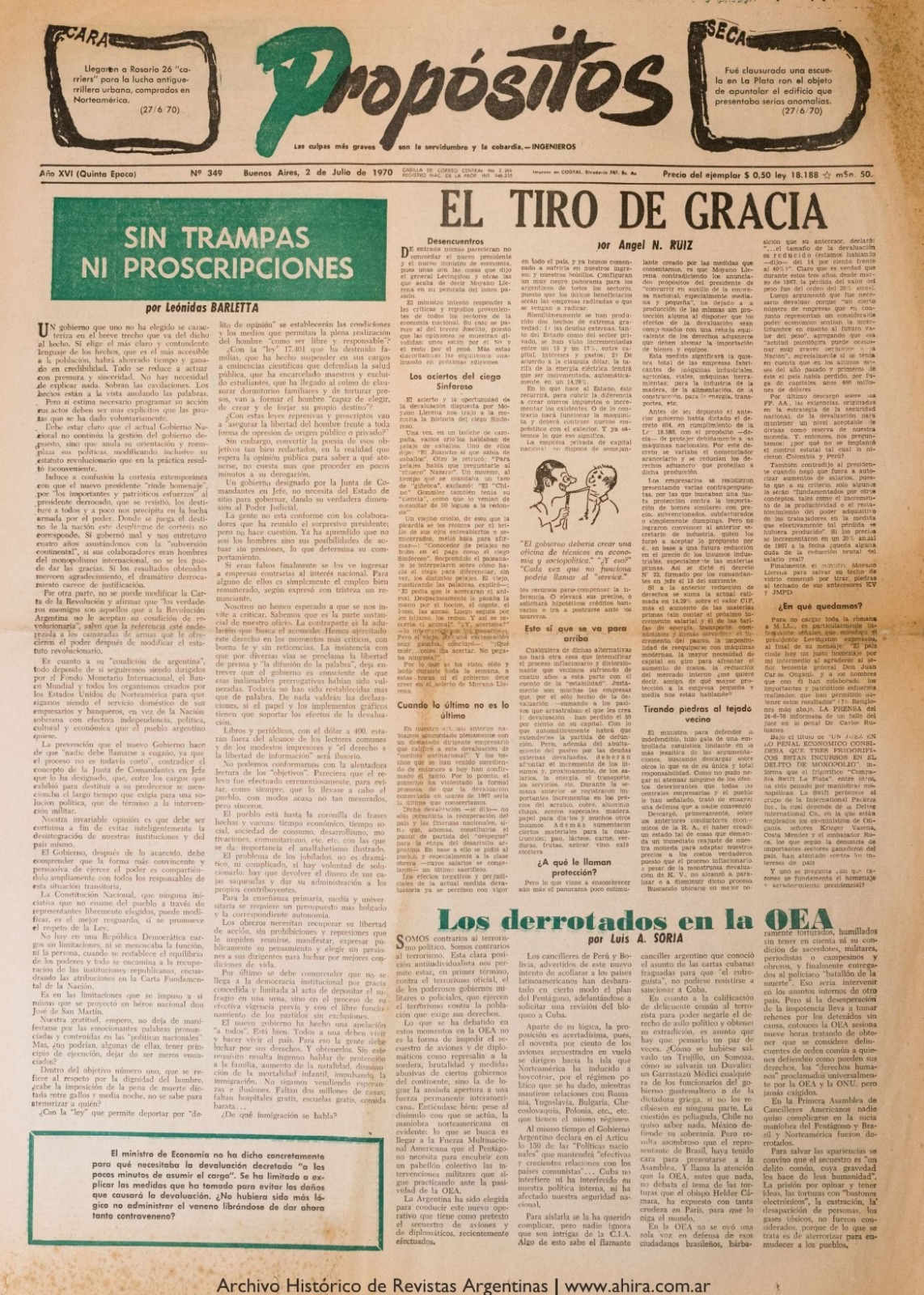 Asimismo, por estos años, se publicaron una gran cantidad de revistas y diarios en los cuales, en el contexto de la Guerra Fría, se pronunciaron en contra de esta guerra. Argentina no fue la excepción. A continuación pueden apreciar uno de los tantos ejemplos por medio de Propósitos, una publicación dirigida por Leónidas Barletta, director del Teatro del Pueblo. Fue editada entre 1951 y 1976 y se caracterizó por el debate político, principalmente en torno a las denuncias en contra del imperialismo y su relación con las guerras de Indochina, Argelia y Vietnam. Tal y como Propósitos lo declaró desde su primer número, se propuso ser un “periódico definido en el panorama nacional” por medio de sistemáticas reflexiones acerca de la soberanía nacional en un contexto signado por la guerra fría y los movimientos de liberación surgidos al calor de la Revolución Cubana. Si están interesados/as pueden acceder a muchos números de esta publicación y otras en www.ahira.com.ar