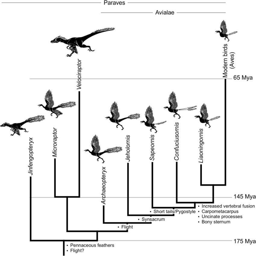 Las primeras aves-dinosaurio o dinosaurios-ave (denominadas paraves) tenían plumas y alas pero se cree que no volaban. Sus plumas eran menos complejas que las plumas de las aves actuales. La evolución y diversificación de estos grupos nos lleva hasta las aves modernas. Las aves actuales poseen características propias, como un sello de autenticidad, las alas, las plumas complejas, los huesos livianos que posibilitan el vuelo y un esqueleto preparado para sostener los músculos de las alas. Todas estas características surgieron a lo largo de la historia evolutiva de las paraves como puede observarse en el árbol evolutivo de la Figura 13.