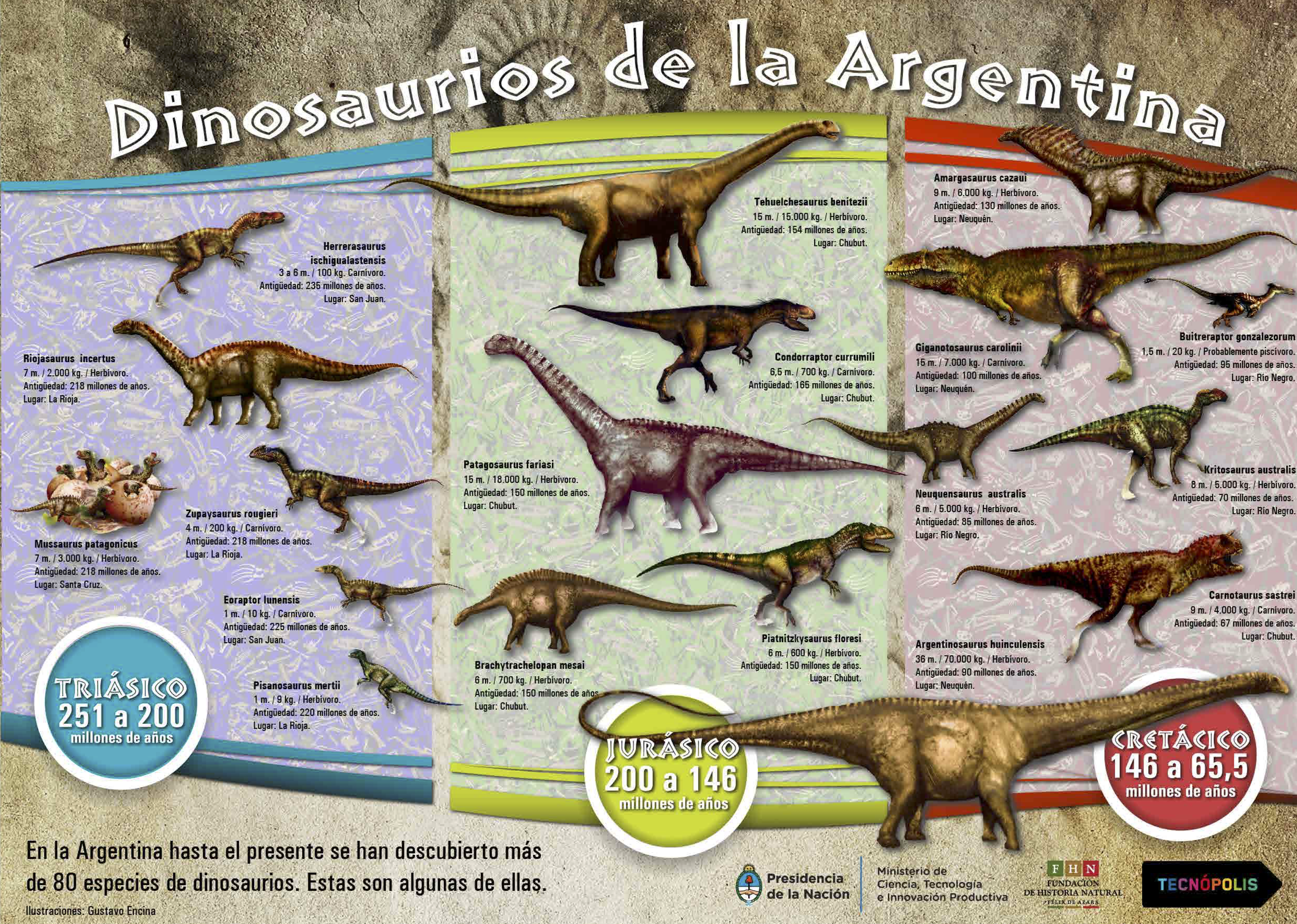 Figura 6: Dinosaurios de la Argentina del período triásico, jurásico y cretácico. Fuente: Recursos educativos del sitio web de Fundación Azara.