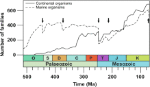 La segunda gran extinción ocurrió entre el devónico y el carbonífero y se perdió alrededor del 70% de las formas vivas.