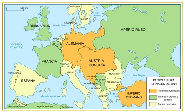 En este mapa se muestra las alianzas durante la Primera Guerra Mundial.