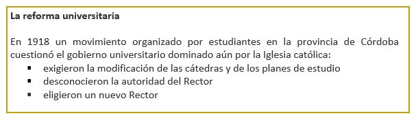 Durante este primer gobierno de Hipólito Yrigoyen los acontecimientos conocidos como “Reforma Universitaria de 1918” se iniciaban en la provincia de Córdoba. Allí, estudiantes universitarios protestaron contra lo que consideraban prácticas autoritarias y dogmáticas de quienes dirigían la universidad.
