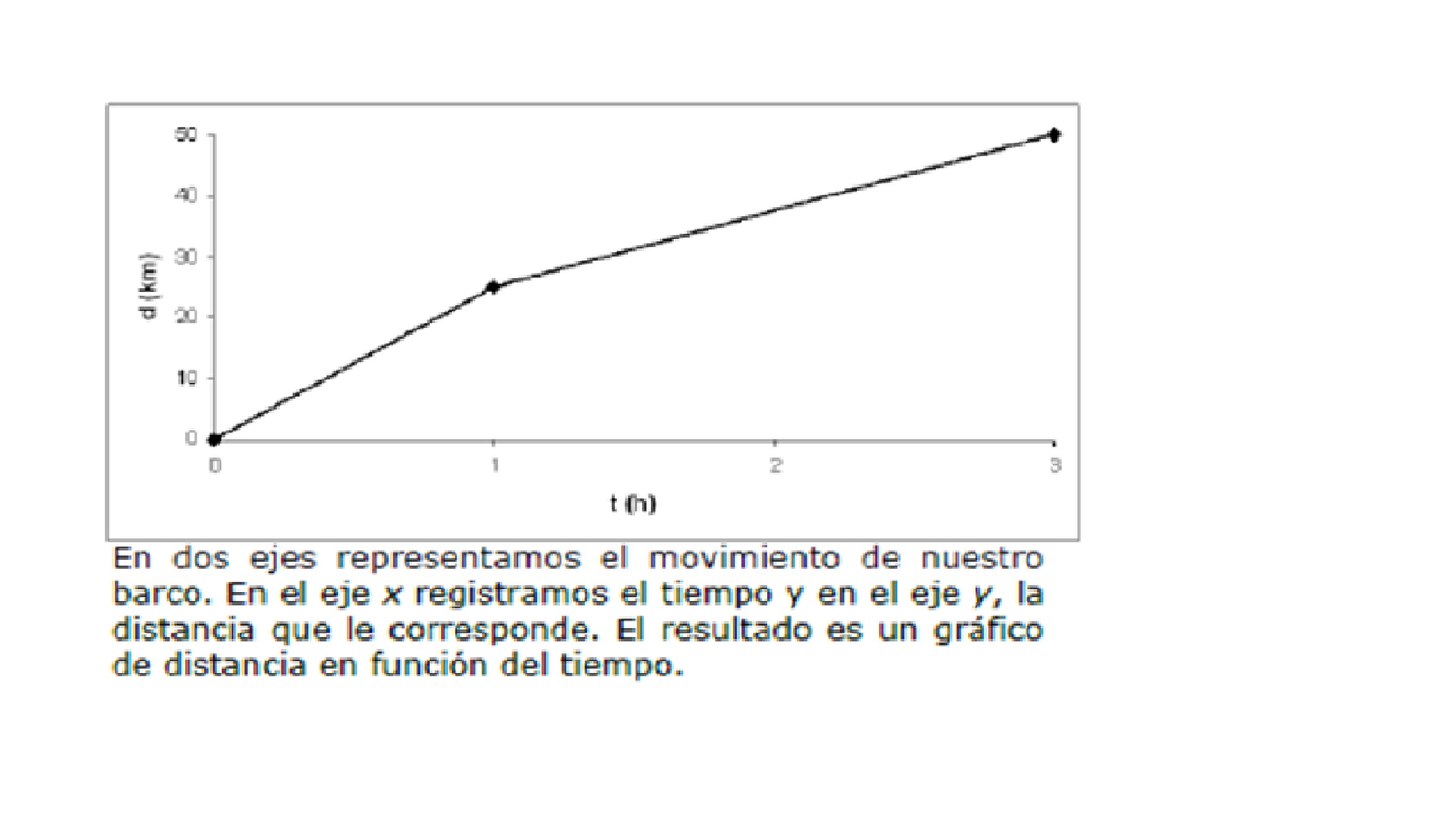 En el gráfico de distancia recorrida en función del tiempo, cada punto del gráfico indica qué distancia ha sido recorrida por el cuerpo en movimiento (llamado móvil) al tiempo correspondiente. Fíjense el siguiente gráfico del ejemplo del barco: