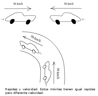Si miran el siguiente esquema, los cuatro coches en movimiento tienen la misma rapidez (50 km/h) pero sus velocidades son distintas porque comparando la dirección de los dos coches en el dibujo de abajo, o el sentido de ambos en el dibujo de arriba, son distintos. No es que las velocidades sean distintas porque una sea mayor o menor que la otra, en este caso son iguales en valor numérico (50 km/h). Son distintas porque difieren en la orientación espacial del movimiento (los coches van “para lados distintos”).