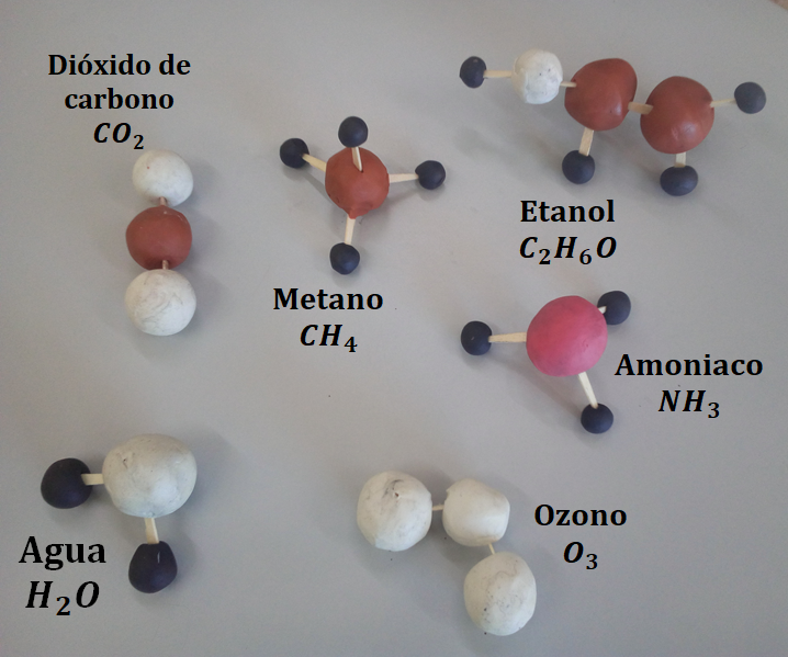 Ahora bien, las sustancias en las que los átomos se enlazan por UNIONES COVALENTES forman MOLÉCULAS. En este caso, la fórmula química indica cómo está compuesta la molécula. Por ejemplo, el gas Cl2 está formado por unidades de Cl-Cl, es decir, moléculas en las que hay dos cloros unidos por un enlace covalente simple. Las sustancias como el gas Cl2, el dióxido de carbono (CO2), el agua (H2O), el metano (CH4), el etanol (C2H6O) o el azúcar de mesa (C12H22O11) están formadas por moléculas. En cada molécula, los átomos se mantienen unidos por enlaces covalentes y a su vez las moléculas se encuentran unidas entre sí por otras fuerzas, que llamamos fuerzas intermoleculares (ENTRE moléculas). Estas fuerzas son muy débiles en el gas Cl2 o en el CO2, por lo que estas sustancias se encuentran en forma de gases a temperatura ambiente. En el agua, el etanol o el azúcar de mesa, las fuerzas intermoleculares son más intensas y por lo tanto, las moléculas logran mantenerse unidas formando un líquido en el caso del agua y el etanol, y un sólido en el caso del azúcar a temperatura ambiente. Como ven el estado de agregación (sólido, líquido o gaseoso) en las sustancias moleculares depende fundamentalmente de la INTENSIDAD O MAGNITUD de las fuerzas entre sus moléculas. La magnitud de estas fuerzas a su vez depende de la geometría (distribución de los átomos de la molécula en el espacio), tamaño de la molécula y distribución de sus cargas. En la imagen de abajo se muestra en forma esquemática la geometría de distintas moléculas: