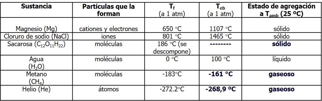 En general, de acuerdo con el tipo de enlace, hay regularidades en el estado de agregación de las distintas sustancias a temperatura ambiente: