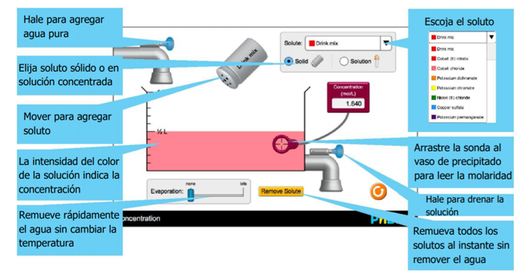Vamos a ver cómo varia la concentración de un soluto sólido (por ejemplo una sal) en un solvente líquido (por ejemplo agua) con un simulador.