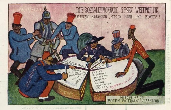 Si bien las potencias europeas ya ejercían cierto control de las costas africanas y asiáticas (a través del comercio y del sistema de factorías), hacia 1880 se emprendió la conquista de los territorios internos, ejerciendo una dominación total sobre los territorios coloniales. Todo este proceso implicó una gran violencia y represión sobre la población nativa de las colonias. A su vez, el “reparto del mundo” generó una división internacional de trabajo, rivalidades y competencias entre las diferentes potencias, como veremos más adelante. En la siguiente imagen, podemos advertir cómo los representantes de diversas naciones se reparten el globo (como si fuera una torta), mientras que uno de ellos (Alemania), es impedido para apropiarse de su parte (aludiendo a la tardía apropiación de colonias por parte de Alemania).