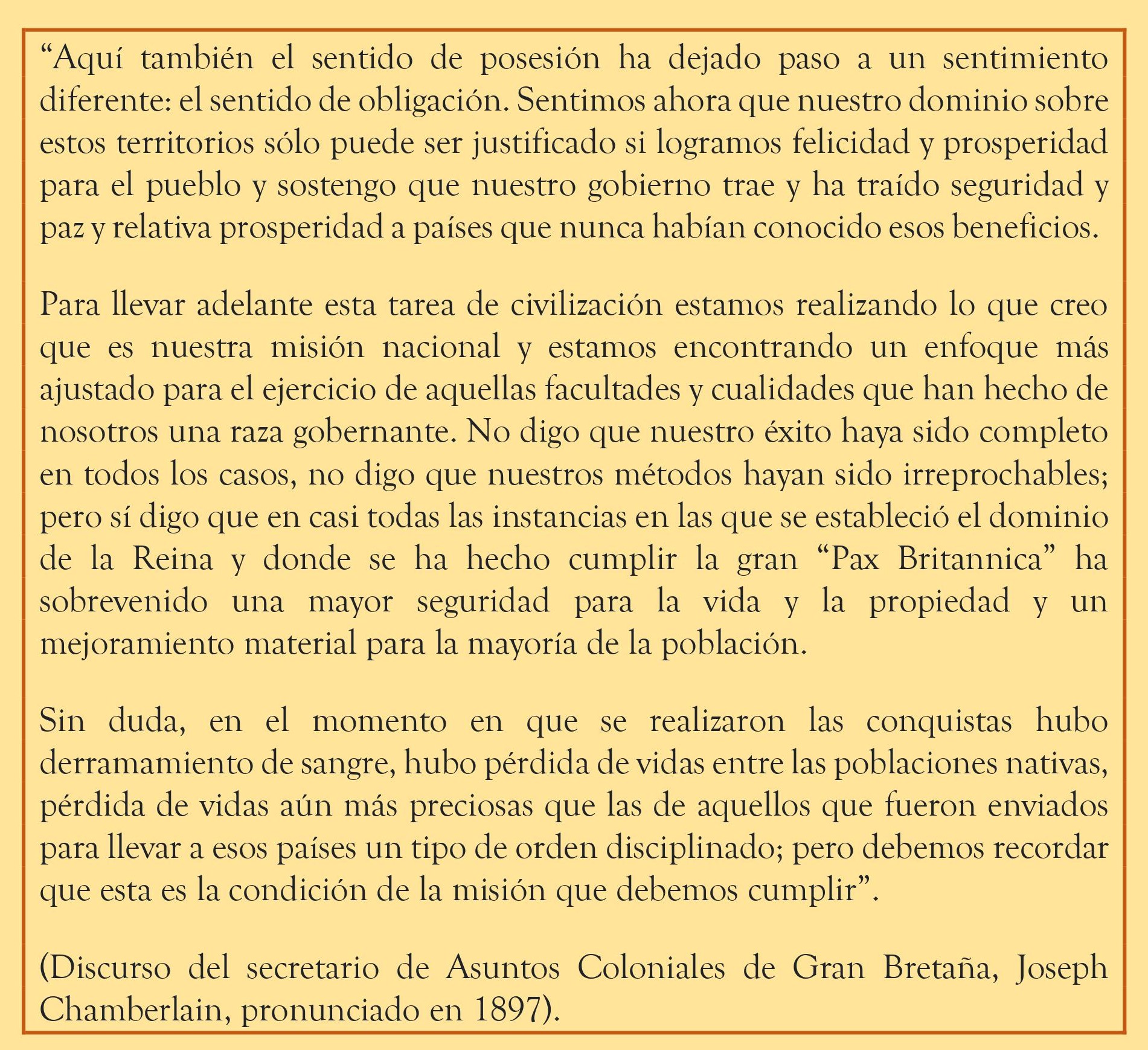 Existen diversas interpretaciones por parte de los historiadores, como también analistas de la época. Por un lado, algunos trabajos ponderan la prevalencia de los objetivos políticos y militares para explicar la expansión imperialista de Europa, por ejemplo, la búsqueda del control de zonas estratégicas, o bien, objetivos de tipo ideológicos: exaltar un orgullo imperial en sus naciones, para, entre otros motivos, reducir los conflictos sociales internos. Así, la expansión industrial y de los Estados era considerada una demostración de la fuerza de la nación. En este sentido, el nacionalismo fue uno de los argumentos de la expansión imperialista: la misma estimulaba un sentimiento de superioridad étnica (por sobre los pueblos sometidos), y era vista como una misión civilizadora sobre los pueblos considerados "atrasados". El capitalismo era concebido, entonces, como símbolo del progreso y de la civilización. Los/as invitamos a leer el siguiente fragmento del secretario de Asuntos Coloniales de Gran Bretaña, en el cual se advierten algunas de estas cuestiones: