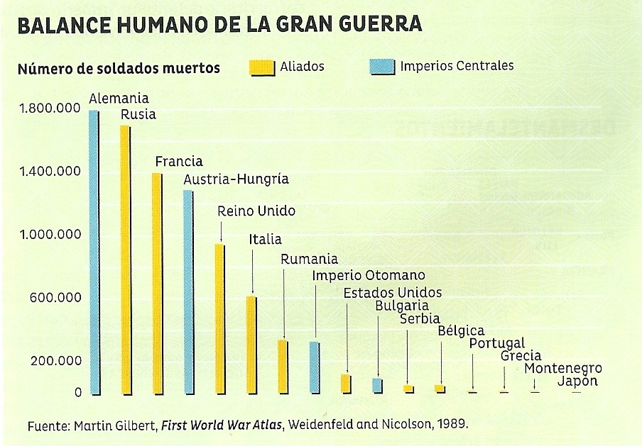 La guerra implicó un quiebre con respecto al mundo previo, a la confianza en el crecimiento económico, el progreso y los valores liberales. Fue una guerra novedosa en muchos sentidos, si tenemos en cuenta el grado de violencia que se evidencia en el número de soldados muertos y sobrevivientes mutilados, y sobre todo, de bajas civiles. En el siguiente gráfico podemos apreciar una comparación de las pérdidas humanas que sufrieron las distintas naciones beligerantes.