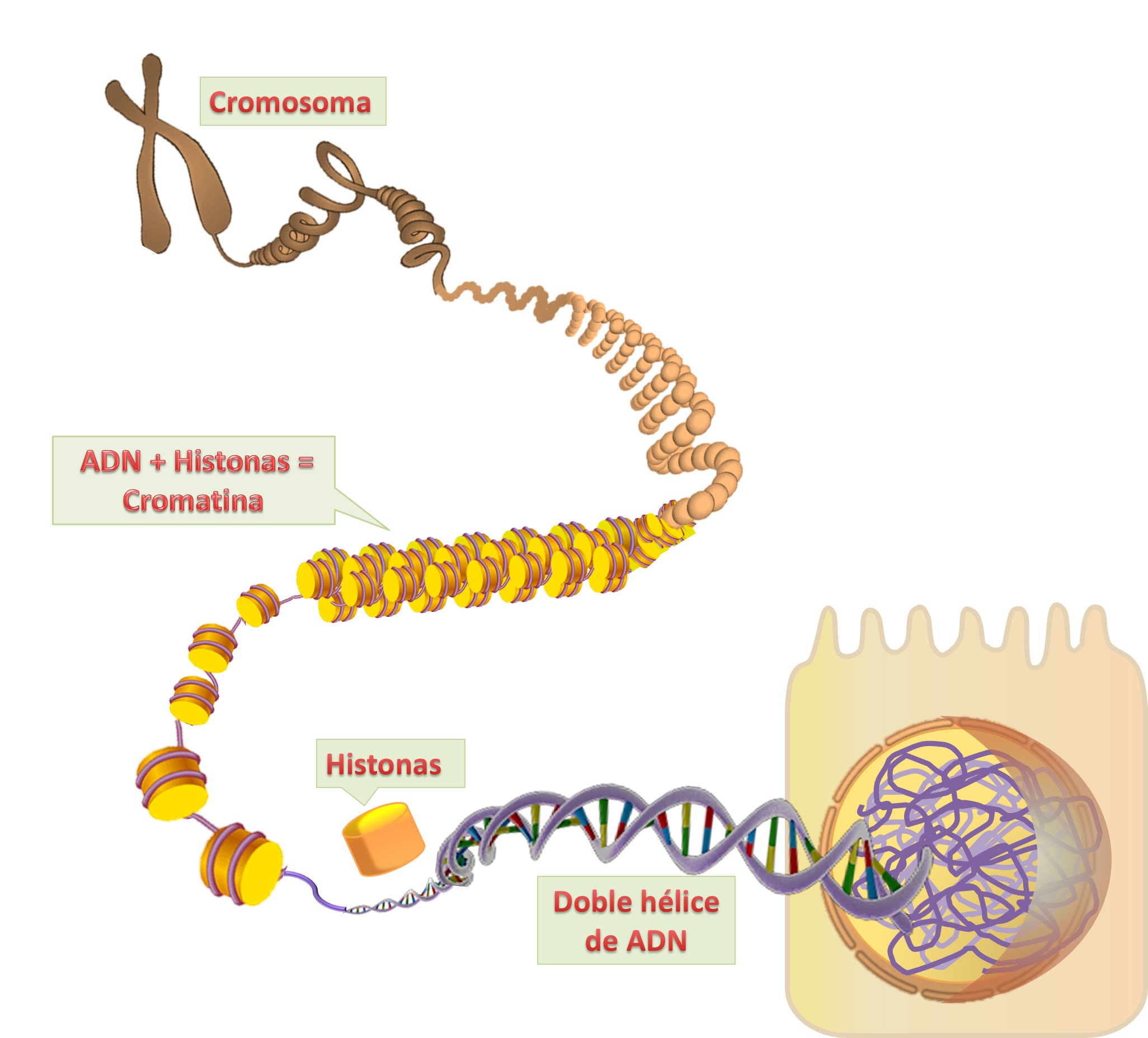 Las moléculas de ADN del núcleo celular son muy largas, están en movimiento y parecieran estar enredadas. Sin embargo, cuando se están dividiendo las células en el organismo (porque está en crecimiento o para reproducirse) todo se encuentra asombrosamente organizado. Sin esta organización sería impensable que las células hijas reciban la información adecuada (nada de más, nada de menos) y no una mezcolanza de ADN enredado. El ADN se empaqueta organizadamente de manera tal que al dividirse la célula, la información se reparte equitativamente, sin hacer diferencias, entre las células hijas. Estas estructuras de ADN compactado se denominan cromosomas. Esto ocurre en varios pasos sucesivos, con niveles de compactación creciente, y gracias a la presencia de proteínas como las histonas que colaboran en la organización del material.